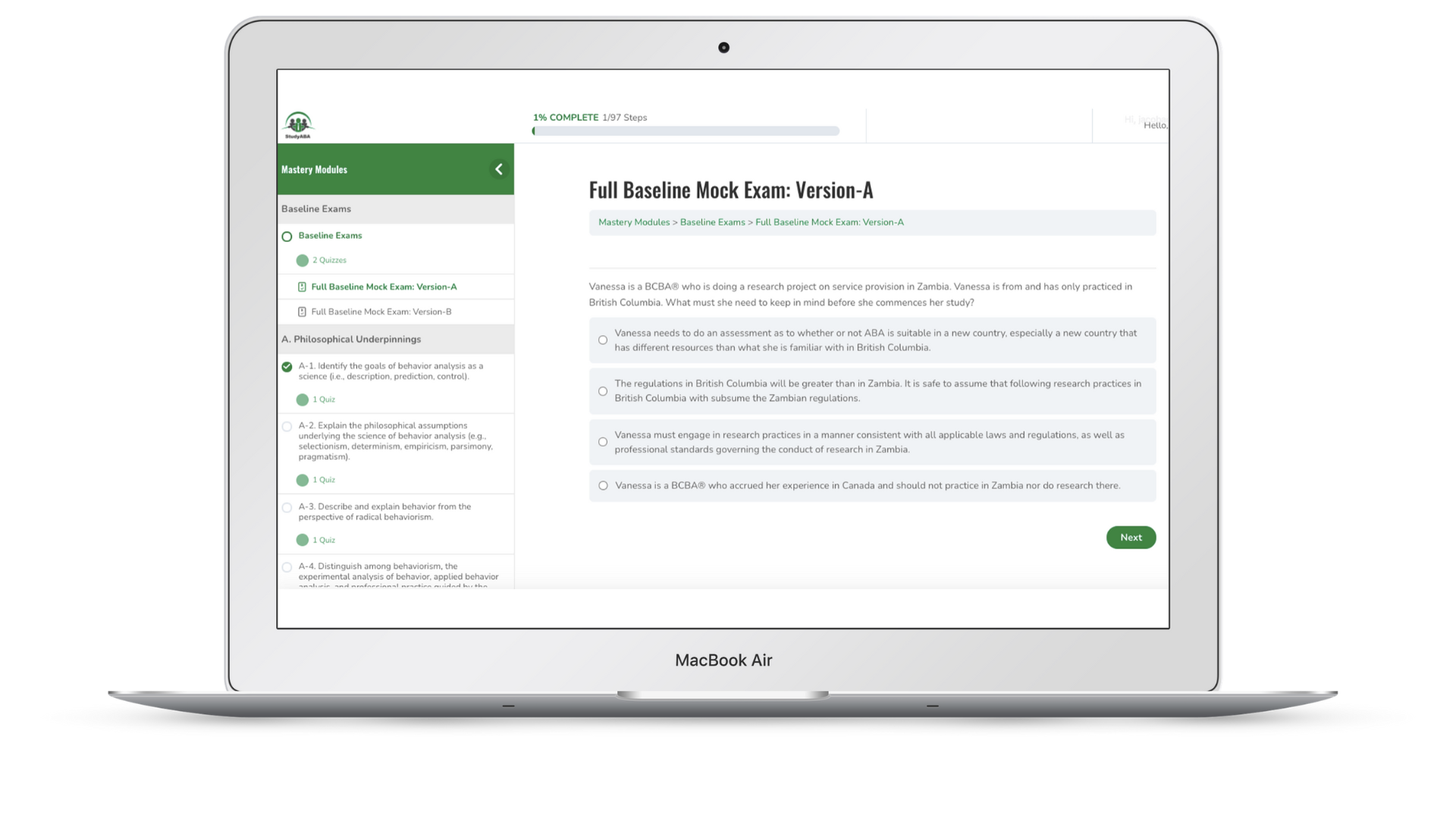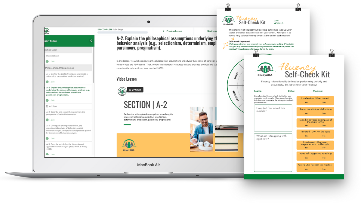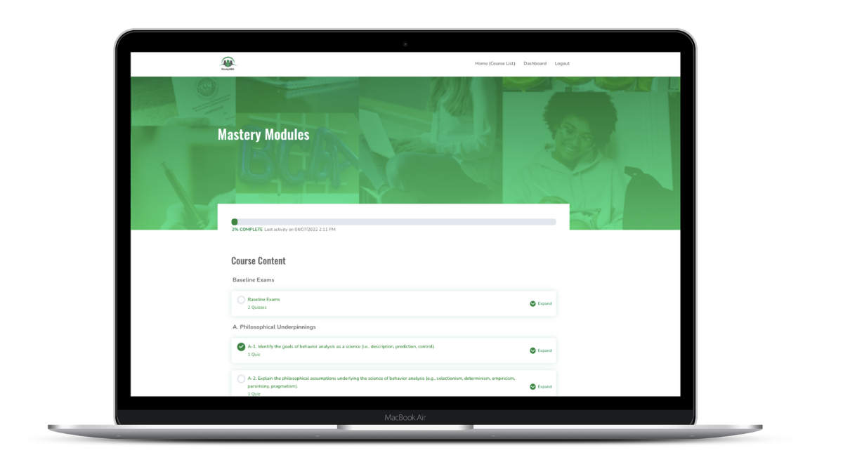 We are confident that you will pass the real BCBA® exam after you complete all of the Mastery Modules and pass the post-test. However, if you do not pass the real exam after completing all of the modules and passing the post-test, we will give you your money back. Money Back Guarantee criteria: